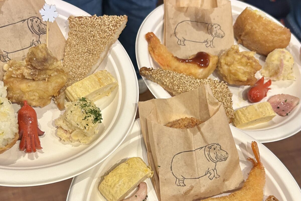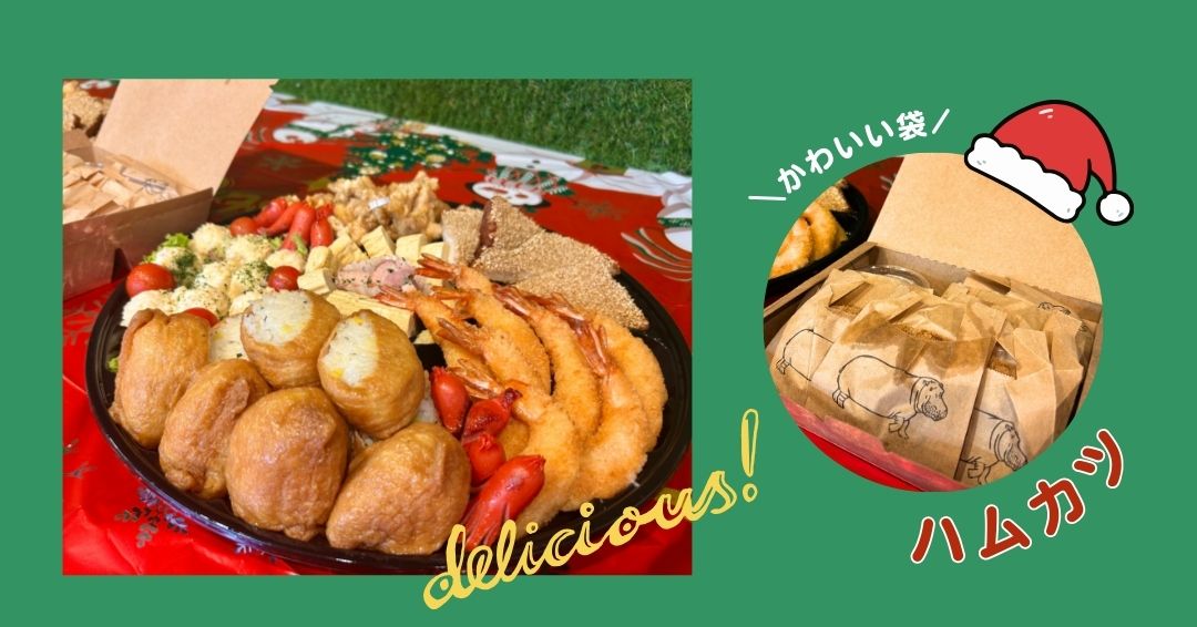 テーブルには、エビフライやお稲荷さん、ハムカツなど、豪華なメニューが勢ぞろい!