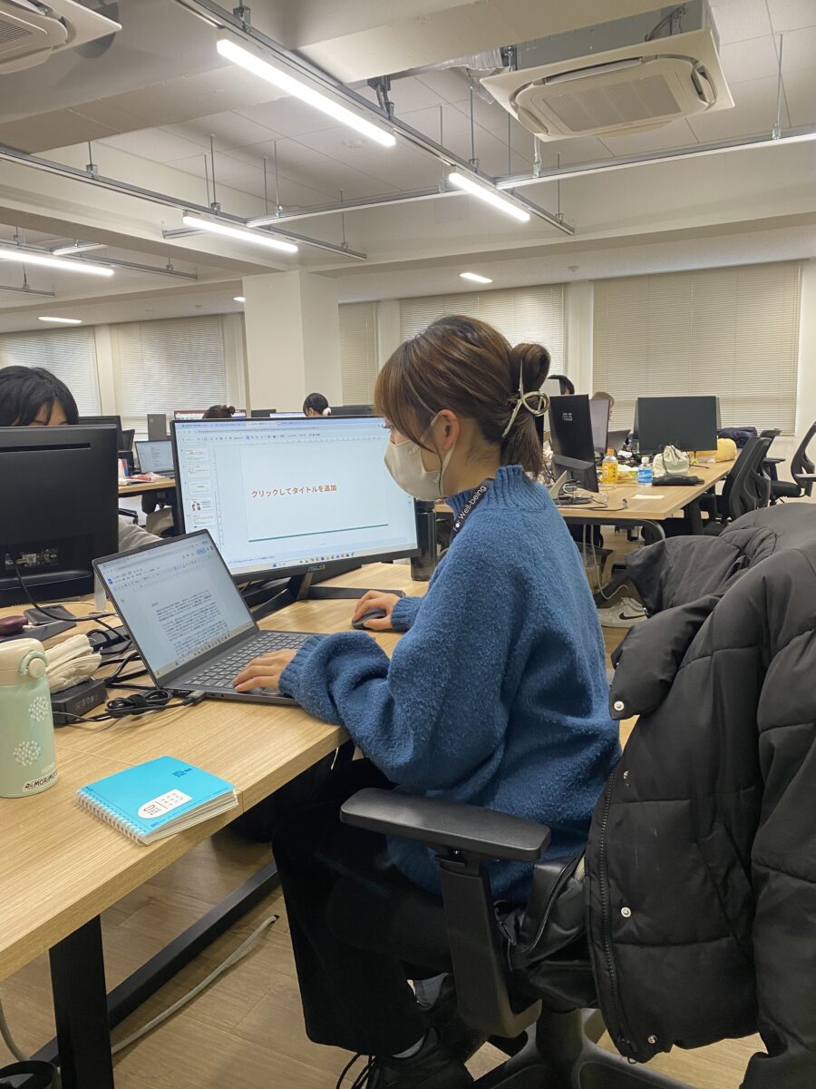 まだまだわからないことが山積みではありますが、新入社員として入社する4月までに今学んでいる基礎をさらにしっかり固め、4月からは自信を持って業務に取り組めるよう努めたいと考えています。同期と協力しながら、社員の皆様をしっかりサポートできる存在になることを目指して、より一層努力していきます!